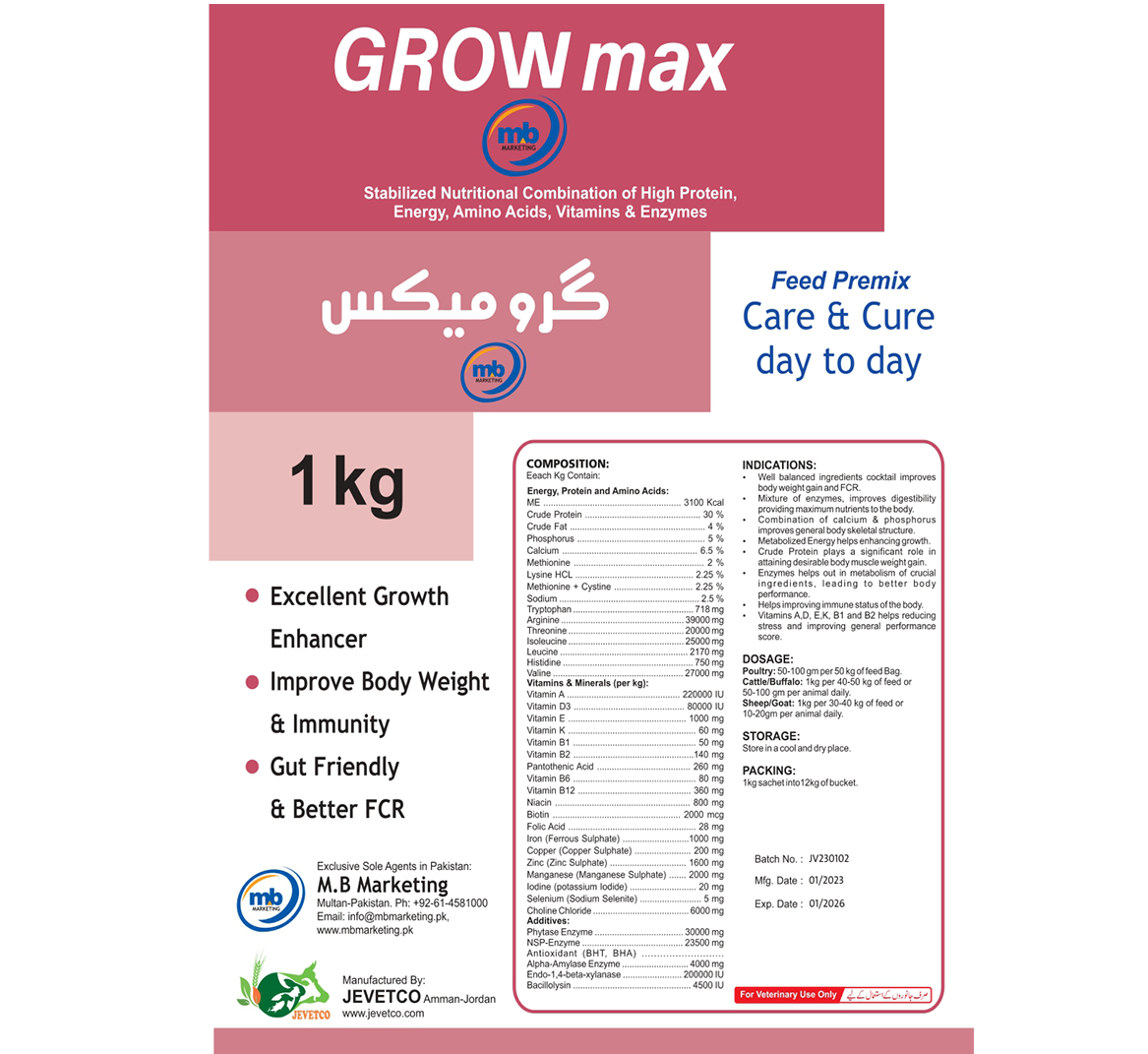 Grow Max (Concentrates) for Animals is a high-quality nutritional feed concentrate specially formulated to support healthy growth, weight gain, and overall performance in animals. It contains a balanced blend of energy-rich ingredients, high-quality proteins, essential amino acids, vitamins, and minerals that work together to promote efficient growth and optimal feed utilization. Grow Max supports strong muscle development, healthy bone formation, and proper metabolic function, helping young and growing animals reach their full genetic potential. It also helps reduce nutritional gaps in daily feed, supports digestive efficiency, and strengthens overall vitality. Suitable for a wide range of animals including cattle, sheep, goats, calves, and poultry, Grow Max can be easily incorporated into regular feeding programs to improve growth rate, body condition, and long-term health.